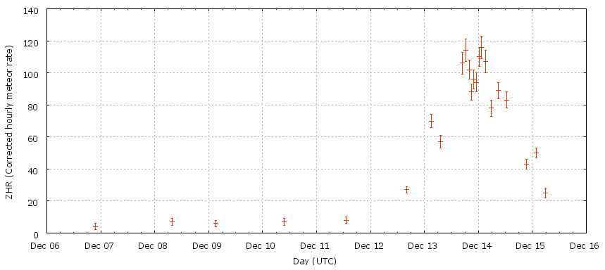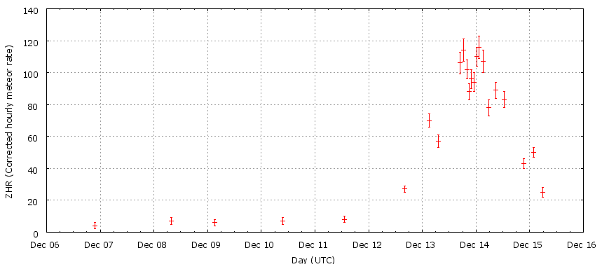 Graph of Geminid ZHR rates as determined from data submitted to the IMO. Credit: International Meteor Organization