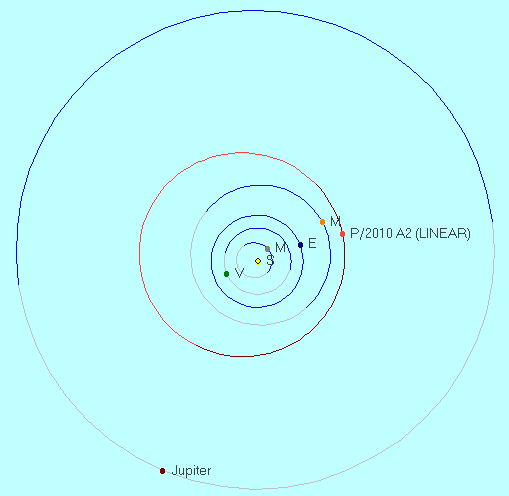 Up to now all of the signs point towards this object being a comet, albeit one that is acting a little strange. That is until you look at its orbit. With a perihelion distance of 1.87 AU, an aphelion of 2.62 AU and a semi-major axis of 2.25 AU, P/2010 A2 is on a very un-comet-like orbit. The orbit more closely resembles the orbit of a Flora family asteroid of the inner Main Belt. Though a few asteroids in the Main Belt have been observed to occasionally show cometary activity (the so called Main Belt Comets), these objects have all been located in the outer Main Belt and are volatile-rich carbonaceous asteroids. The inner Main Belt, and the Flora family especially, is dominated by stoney asteroids with few, if any, carbonaceous objects.