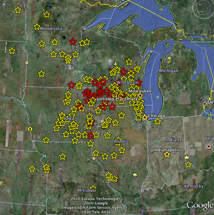 A brilliant and well observed fireball was observed flying over the American Midwest Wednesday evening. The map below shows that sightings were made from Kansas in the south to Minnesota in the north and from Indiana in the east to South Dakota in the north. The yellow stars denote a sighting while the red stars denote reports of sonic booms (a tell tale sign that meteorites may have survived to hit the ground).