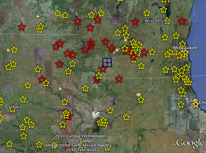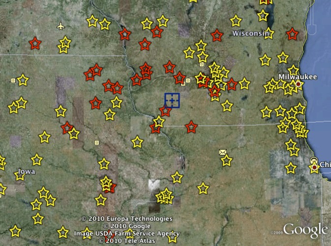 Zooming in on the area where most of the sonic booms were heard brings us to southwestern Wisconsin. We now know that meteorites were found in this area. Not only did the sonic booms and the large number of videos point meteorite hunters to this area but as many as 3 NWS Doppler radars picked up the meteorites as they were falling through the atmosphere. The blue square pinpoints were the radars place the most likely area of meteorite falls.