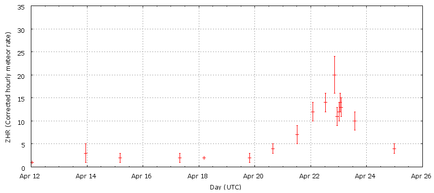 This year’s display was produced the usual number of Lyrids with a peak visual ZHR of ~20 per hour. Over 30 observers from 15 countries reported 396 Lyrids to the International Meteor Organization. Maximum occurred around 20 hours UT on April 22.