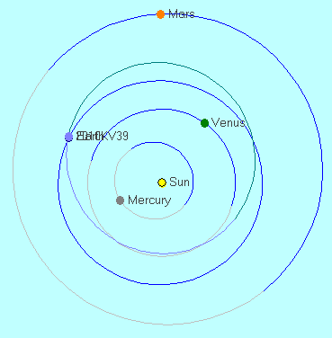 Orbital Parameters for 2010 KV39: Perihelion distance = 0.714 AU Aphelion distance = 0.958 AU Semi-major axis = 1.203 AU Inclination = 13.90° Period = 0.94 years