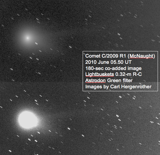 Over the past few nights I have been observing the comet with a remotely operated 0.32-m (12.5″) telescope (part of the LightBuckets network [www.lightbuckets.com]). The images below are from the morning of June 5th. Each image is actually the same only displayed with a different ‘stretch’. The top image shows more detail in the inner coma while the bottom image shows more of the faint tail.
