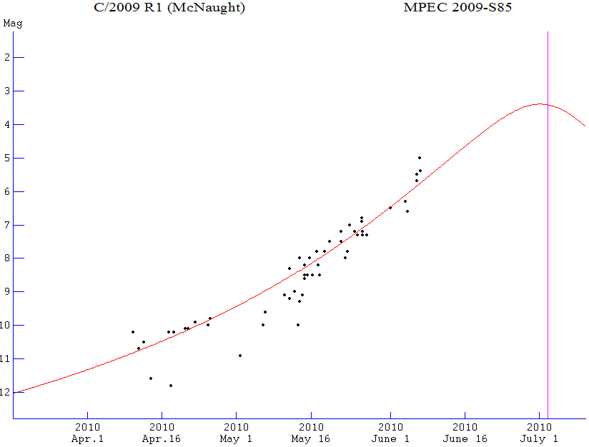 The lightcurve below still shows a rapidly brightening comet which will peak at minimum brightness off 3rd to 4th magnitude early next month.