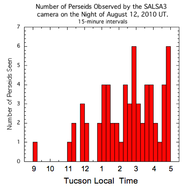 Each camera also recorded a large increase in meteor from the night before. The wide-field camera detected 51 Perseids versus 27 for the night before. The smaller field SALSA3 camera picked up 63 versus 25 for the night before.