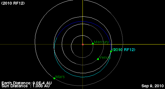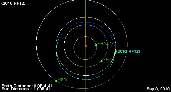 The 2nd asteroid to buzz the Earth is smaller and will pass even closer to Earth. Similar to 2010 RX30, 2010 RF12 was also found at 19th magnitude on the night of Sept 5 UT by Andrea Boattini from Mount Lemmon. With an absolute magnitude of 28.1, it is likely between 5 and 15 meters. Closest approach will occur around 21 hours UT on Sept. 8 at a distance of 0.00053 AU (49,000 miles or 79,000 km) from the center of the Earth. It will be magnitude 13.8 at its brightest. Visually this is much too faint for all but those with very large telescopes under a dark sky.