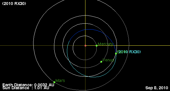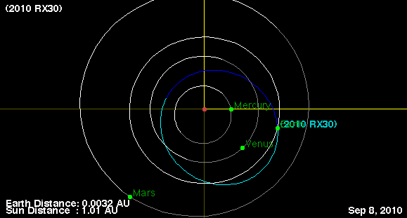 At around 10 hours UT on Sept. 8, 2010 RX30 will pass within 0.0017 AU (149,000 miles/248,000 km) of Earth. For reference the Moon is located at an average distance of 239,000 miles or 384,000 km. We don’t have a direct measurement of its size but based on its brightness (absolute magnitude [H] = 27.1) it is probably between 8 and 25 meters across.