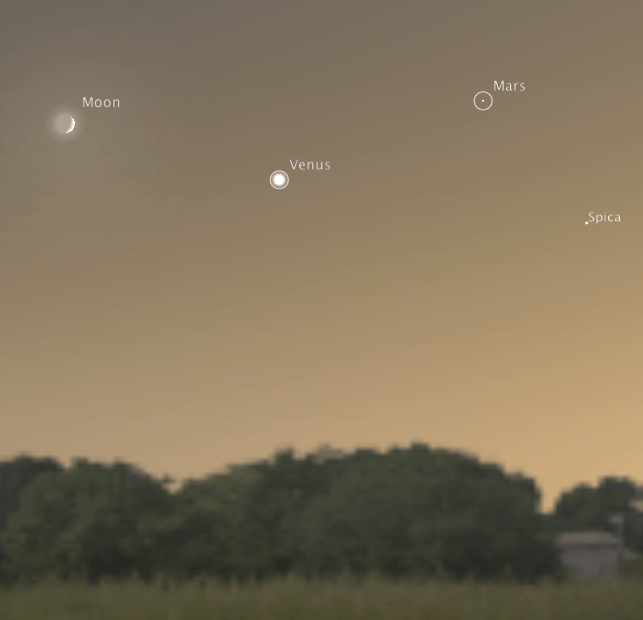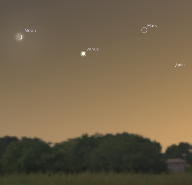Last night the Moon was to the right and below Venus and Mars. Tonight it has moved to the left of the two. Still the Moon is close enough to be used as a guide to easily find Venus, Mars and the bright star Spica.