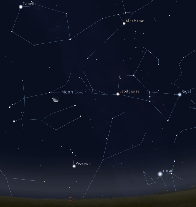 Tonight the Moon doesn’t get high in the sky until after midnight. With the Moon in Gemini, it is among the stars of the winter Milky Way. Many of these stars are bright enough to be seen even in the brightest of cities. Even entire constellations, such as Orion, may be seen.