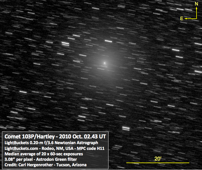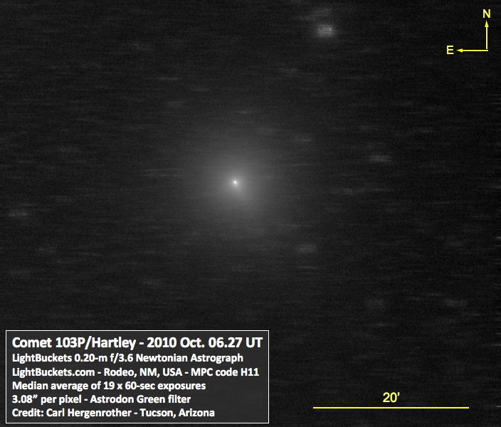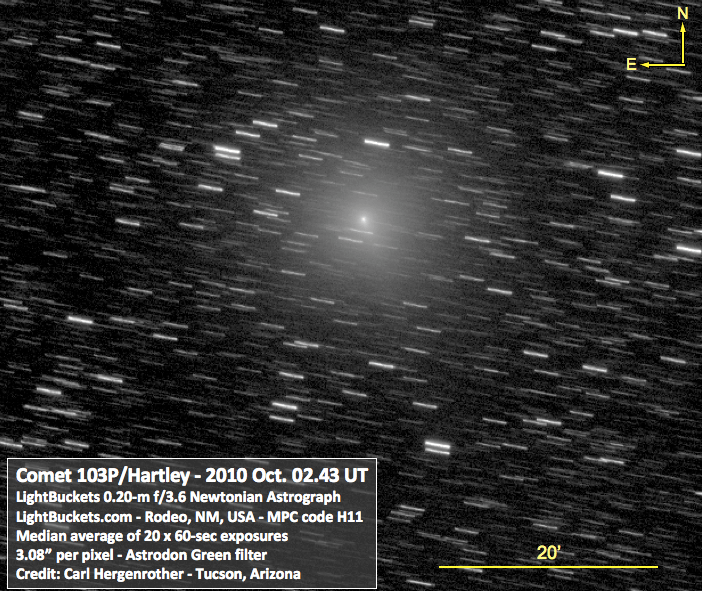 The reason for the difficulty in seeing the comet is twofold. One, the comet is large with recent CCD images finding the comet’s light spread over a coma 36’+ across. Two, any amount of light pollution really does a number on low surface brightness objects. Since most of us live and observe near city lights, objects like Hartley 2 can literally be lost against the bright sky.