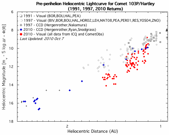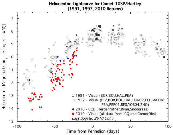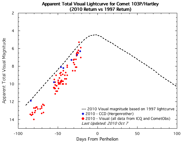 As the graphs below show, the brightness trend has not changed over the past month. All but a single visual estimate has fallen below the expected brightness of the comet (based on its last well observed return in 1997). So unless we are all missing a large fraction of the coma and the comet is actually brighter than is being reported, Hartley 2 is on pace to peak at magnitude +4.5 to +5.0 in two weeks.