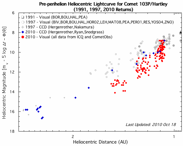 In the previous updates, there was concern that Comet Hartley 2 was not as bright as predicted. We have good data from the 1991 and 1997 returns which suggested that the comet’s 2010 return was running at least a magnitude fainter. There was also a question as to whether this was due to change in the intrinsic brightness of the comet or to difficulty in measuring the brightness of such a large object.