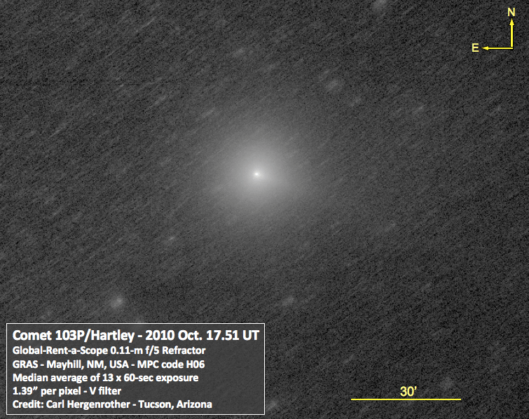 103P was discovered at Siding Spring Observatory (Australia) on March 15, 1986 by Malcolm Hartley. With an orbital period of 6.47 years, the comet’s orbit currently stretches from 1.06 AU to 5.89 AU from the Sun. Though not an especially big or active comet, this year it passes 0.12 AU from Earth on October 21 allowing the comet to get much brighter than usual.