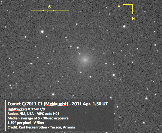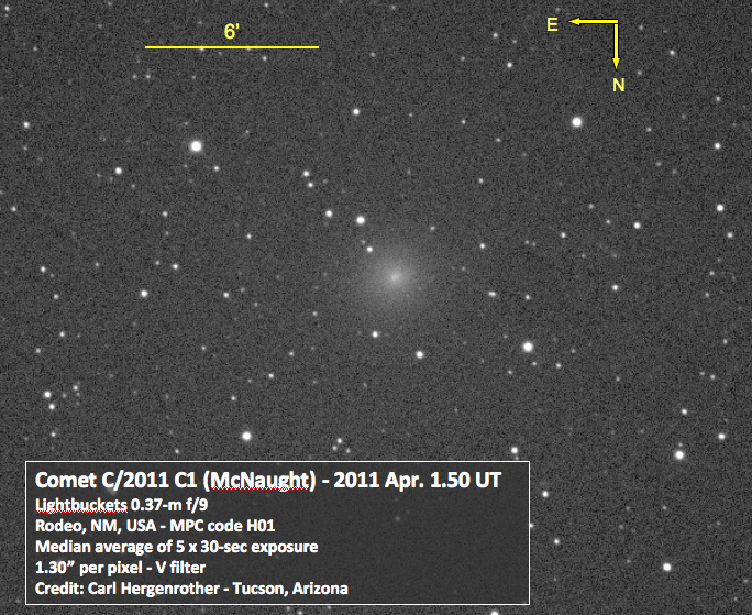 It seems the past couple of years have seen a bright Comet McNaught and this year is no different. The 58th comet discovery by Rob McNaught and 74th from Siding Spring Observatory, C/2011 C1 was first seen on February 10th of this year. Though intrinsically faint, the comet is currently being reported as bright as magnitude 9.0. CCD images taken by the author on Apr 1 UT confirm that the comet is between magnitude 9.0 and 9.5 at this time (see image below). Unfortunately this will probably be as bright as the comet gets as it passes perihelion on April 17 at a distance of 0.88 AU from the Sun. It is also slowly moving away from Earth with a geocentric distance of 0.95, 1.06 and 1.22 AU from Earth at the star, middle and end of the month. Comet C/2011 C1 travels the length of Aquarius before ending the month near the Pisces/Pegasus border.