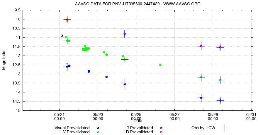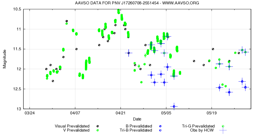 In case your wondering, the PNV J########-####### style designation is a preliminary designation given to suspected novae and supernovae by the Central Bureau of Astronomical Telegrams. The PNV stands for possible nova. PSN would mean possible supernova. The numbers after the J is the Right Ascension and Declination of the suspect. So PNV J17260708-2551454 means ‘a possible nova at Right Ascension of 17h 26m 07.08s and Declination of -25° 51’ 45.4″.