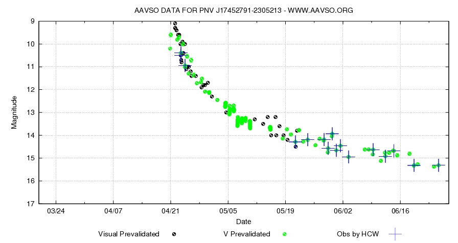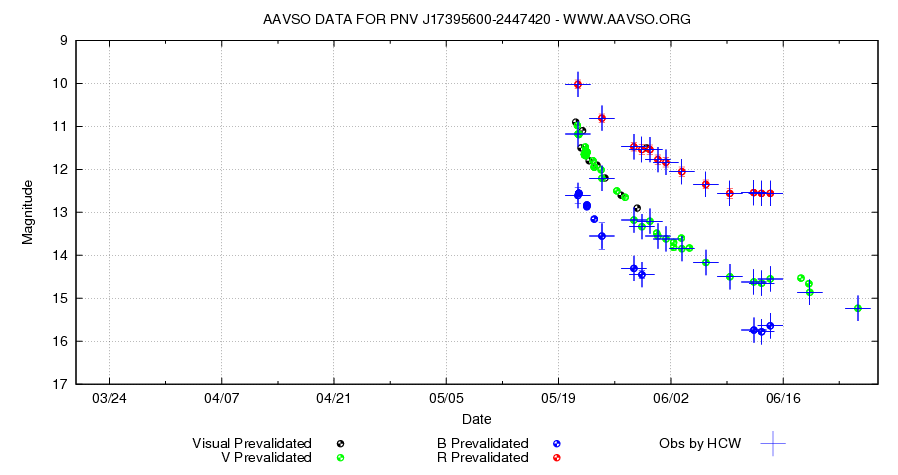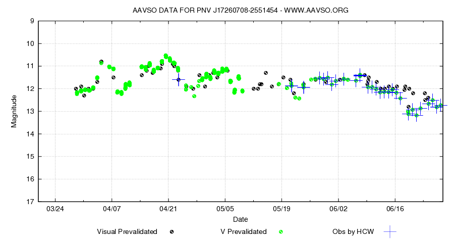 The nova peaked around V magnitude 9.9-10.0 on June 20. Since then it has faded to V magnitude 10.8. It is located a few degrees north of the bright open star cluster M7 at R.A. = 17h50m53s.90, Decl. = -32d37’20”.5 (equinox 2000.0).