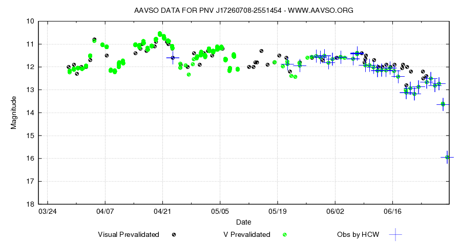 After spending the past 3 months since discovery bouncing back and forth between V magnitude 10.5 and 12.5, Nova Oph 2012 has finally begun to fade. And what a fade! In just the past 24 hours the nova has faded by over 2 magnitudes. Over the past 48 hours the fade has exceeded 3 magnitudes.