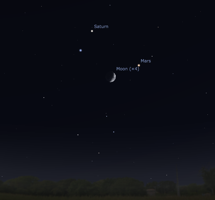 Only a week or so ago, the Moon made a beautiful grouping with 2 planets (Venus and Jupiter) and a bright star (Aldebaran) in the early morning sky. Tonight (evening of July 24) the Moon will team up with a different collection of planets (Mars and Saturn) and a bright star (Spica).